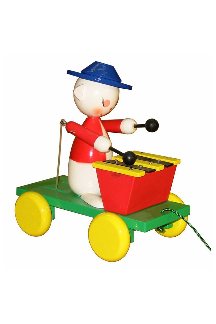 Wooden pull toy that makes a sound when moving. The rotating rear wheels transfer the movement to the figure's hands, which then beat on the xylophone and it makes a pleasant muffled sound. The surface of the toy is smoothly finished and health-safe and certified paints are used. The toy is ideal especially for young children.