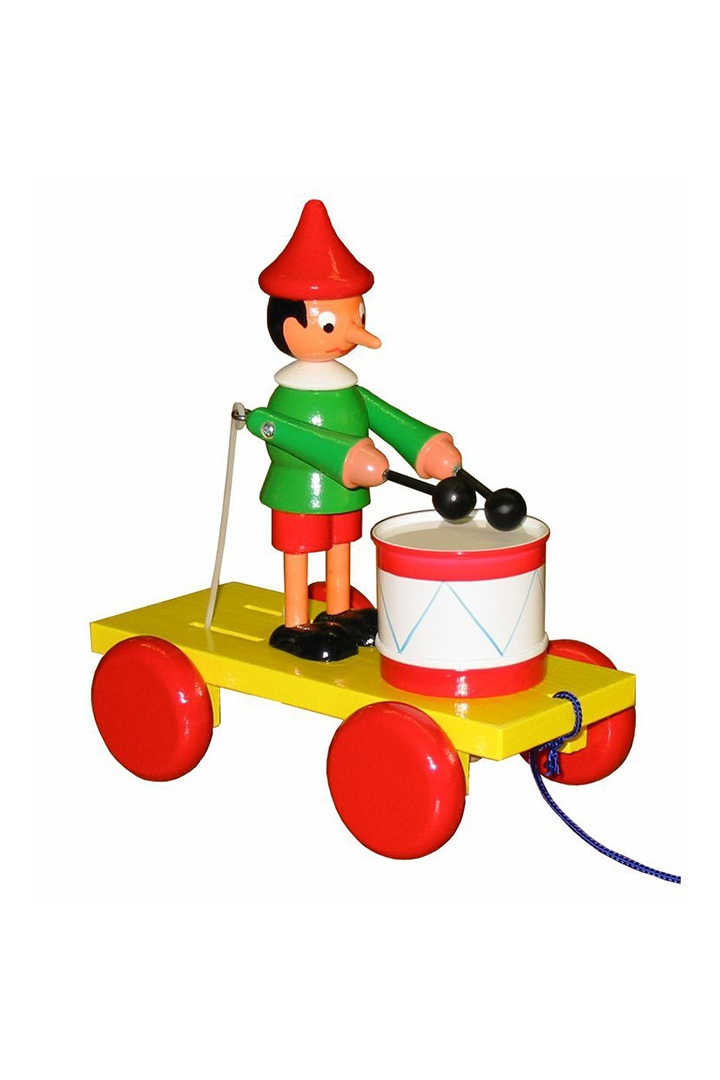 Wooden pull toy that makes a sound when moving. The rotating rear wheels transfer the movement to the figure's hands, which then beat on the xylophone and it makes a pleasant muffled sound. The surface of the toy is smoothly finished and health-safe and certified paints are used. The toy is ideal especially for young children.