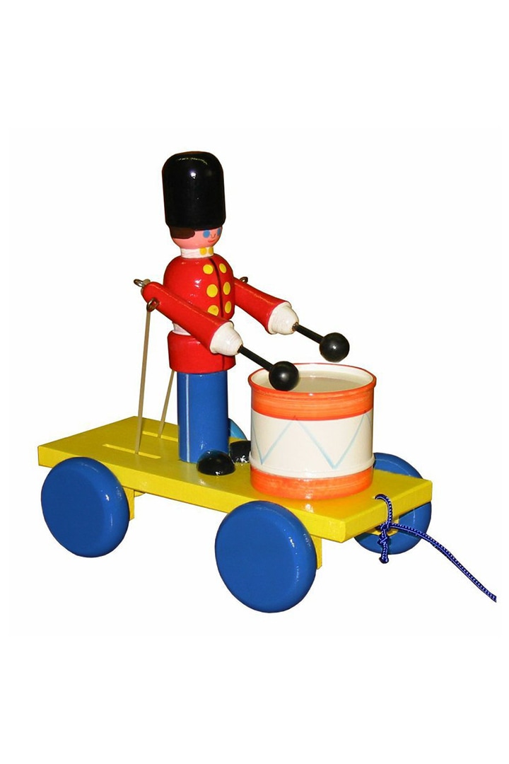 Wooden pull toy that makes a sound when moving. The rotating rear wheels transfer the movement to the figure's hands, which then beat on the xylophone and it makes a pleasant muffled sound. The surface of the toy is smoothly finished and health-safe and certified paints are used. The toy is ideal especially for young children.