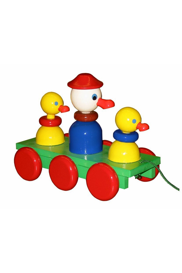 Wooden pull toy. The rotating wheels transfer the motion to the heads of the figures, which move up and down as they go. The surface of the toy is smooth. The toy is ideal especially for young children.