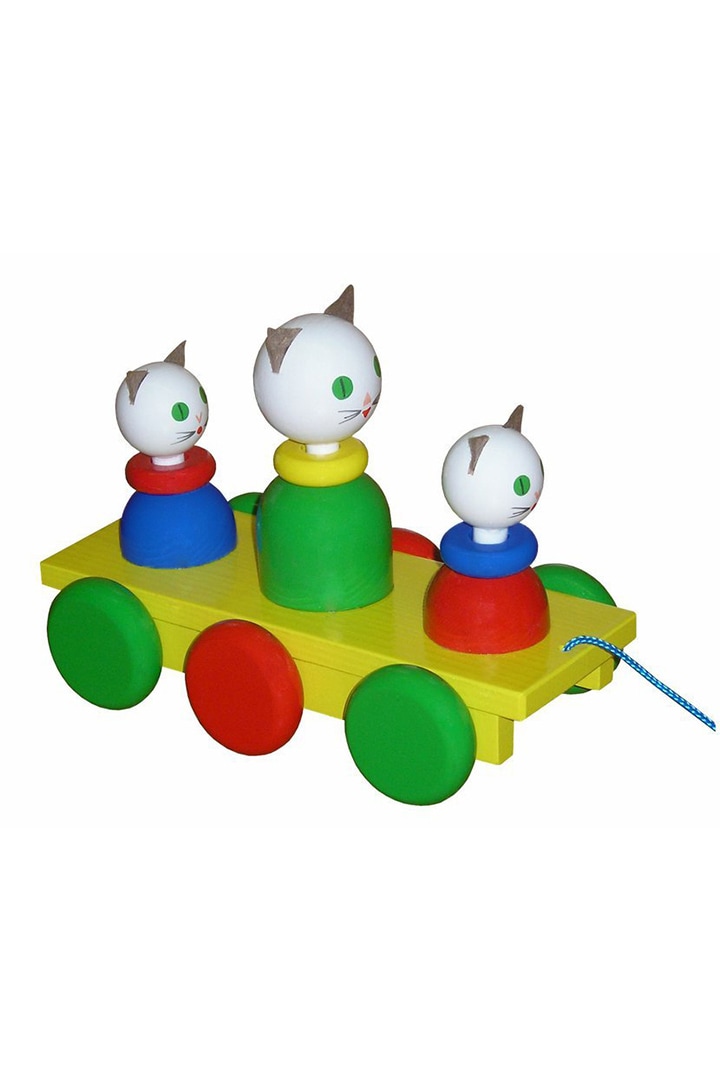 Wooden pull toy. The rotating wheels transfer the motion to the heads of the figures, which move up and down as they go. The surface of the toy is smooth. The toy is ideal especially for young children.