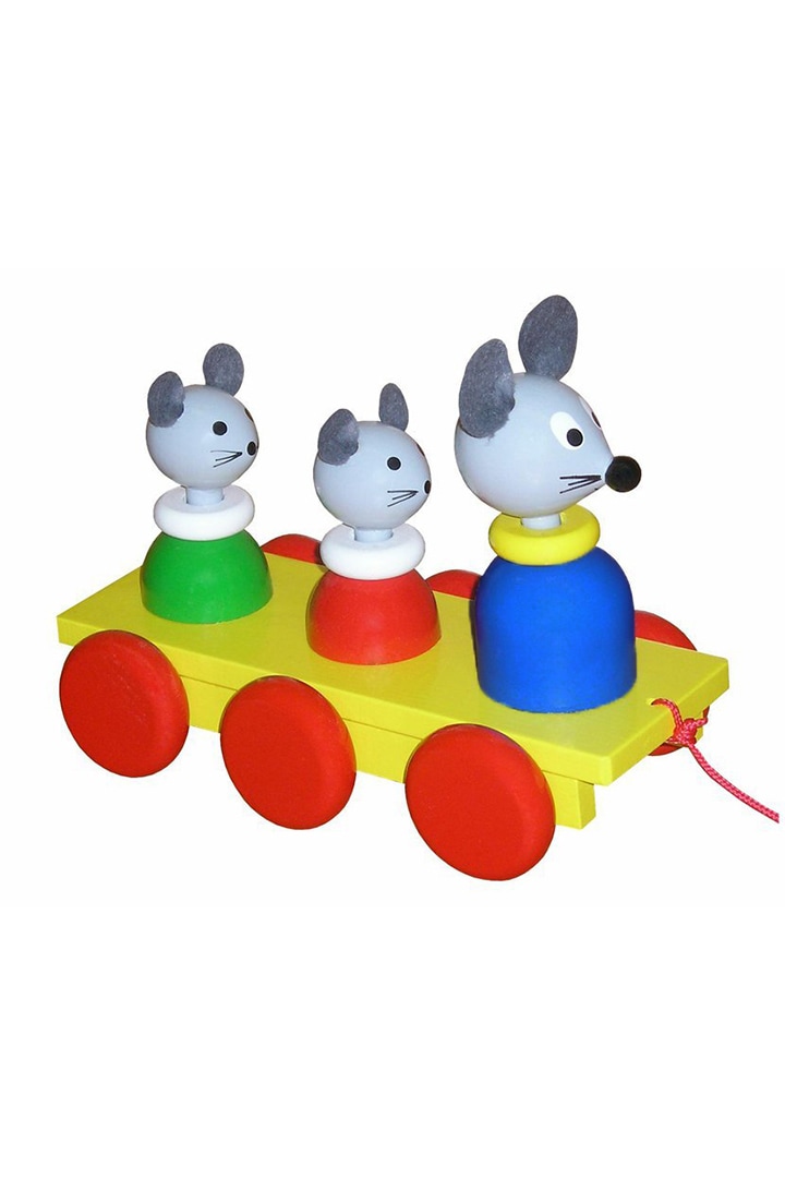 Wooden pull toy. The rotating wheels transfer the motion to the heads of the figures, which move up and down as they go. The surface of the toy is smooth. The toy is ideal especially for young children.