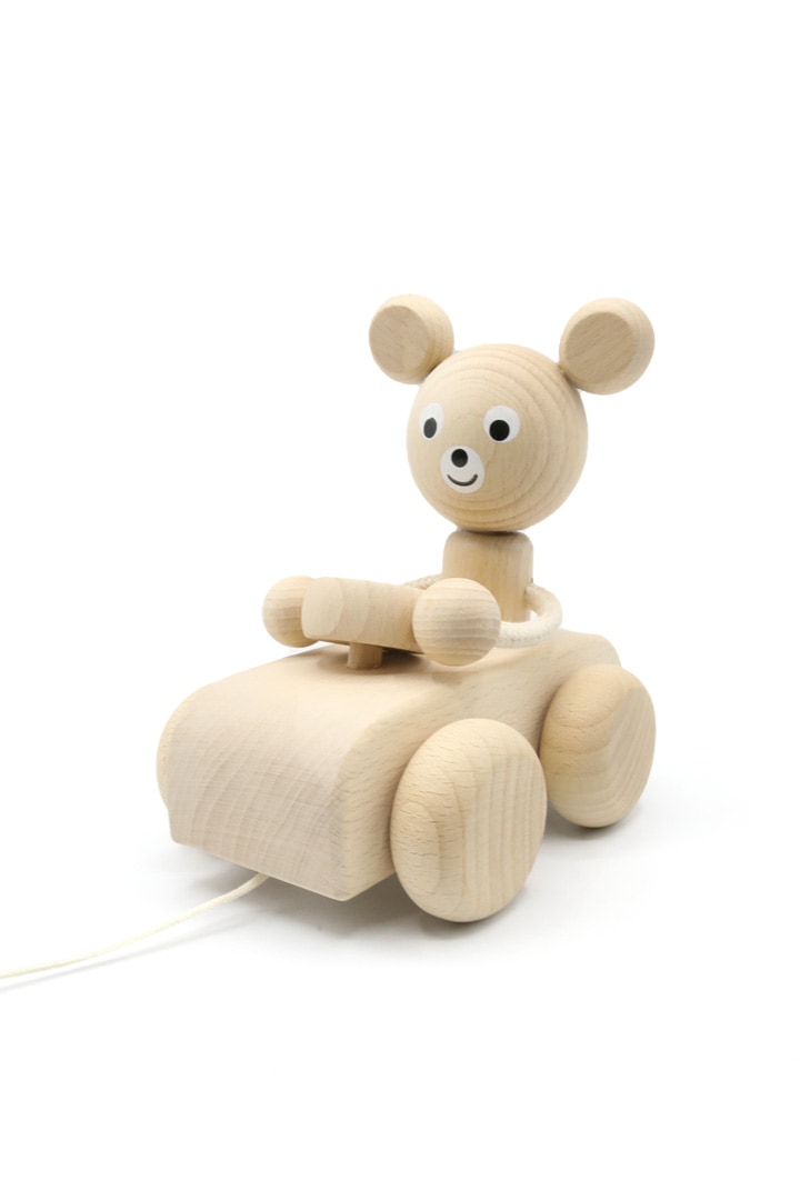 Wooden pull toy. Rotating wheels cause the figure to move. The surface of the toy is smoothly finished and health-safe and certified paints are used. The toy is ideal especially for young and older children.