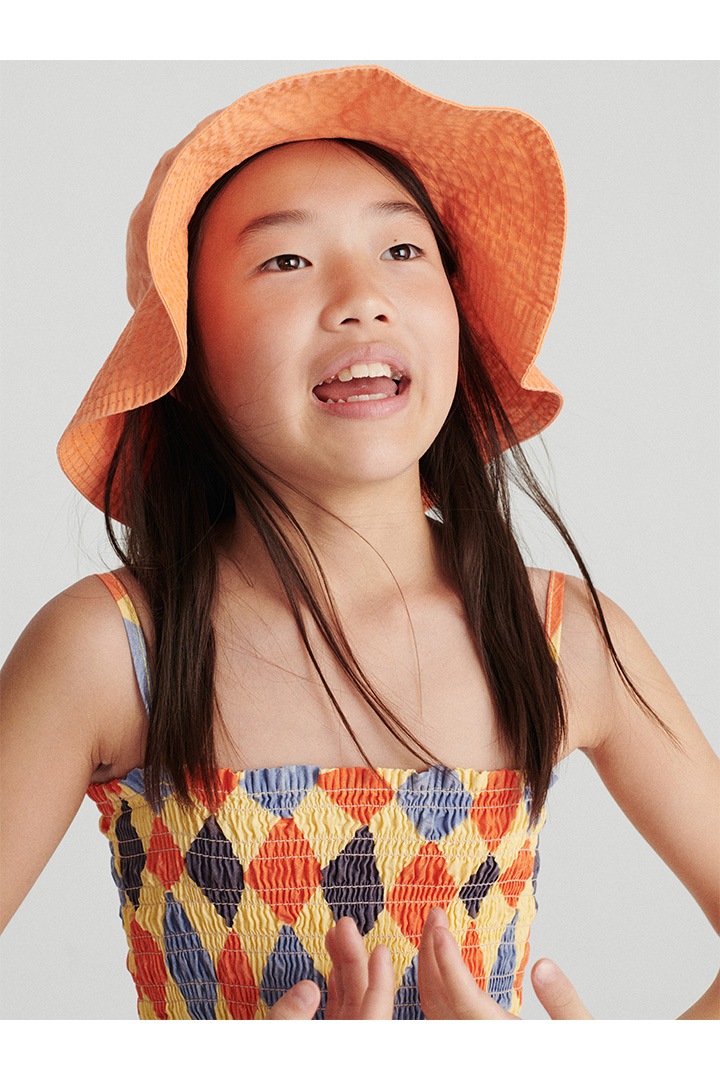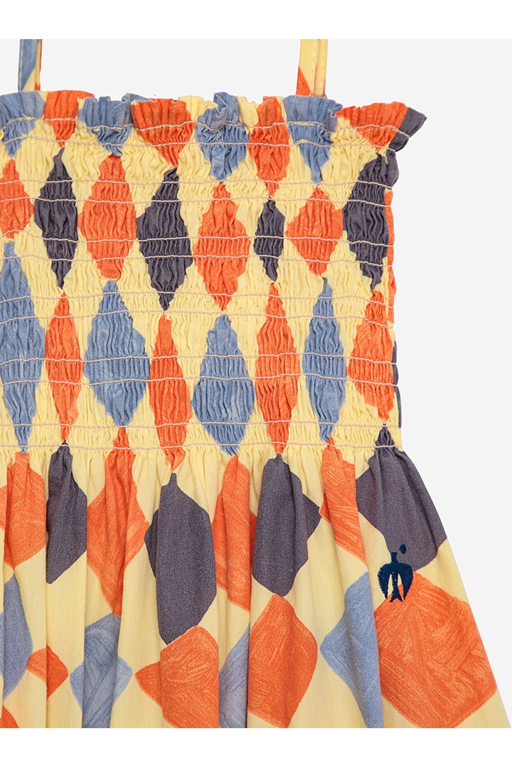 水彩画のようにデザインされた菱形の総柄は、