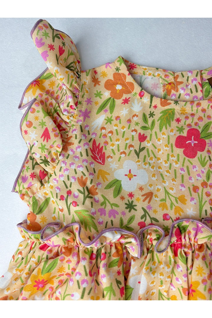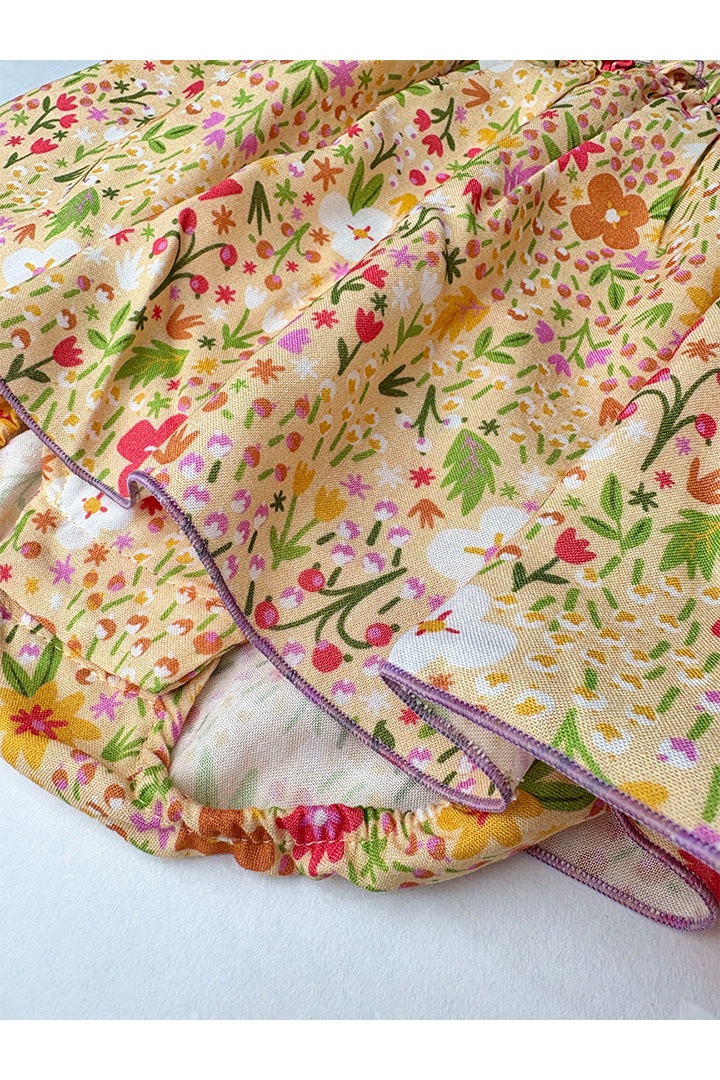 ライトオレンジのベースに、様々なお花がプリントされています。