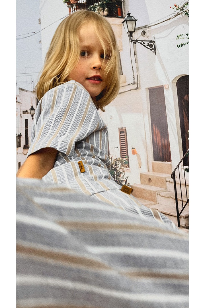 ブラウン、ブルー、ホワイトのストライプが爽やかで