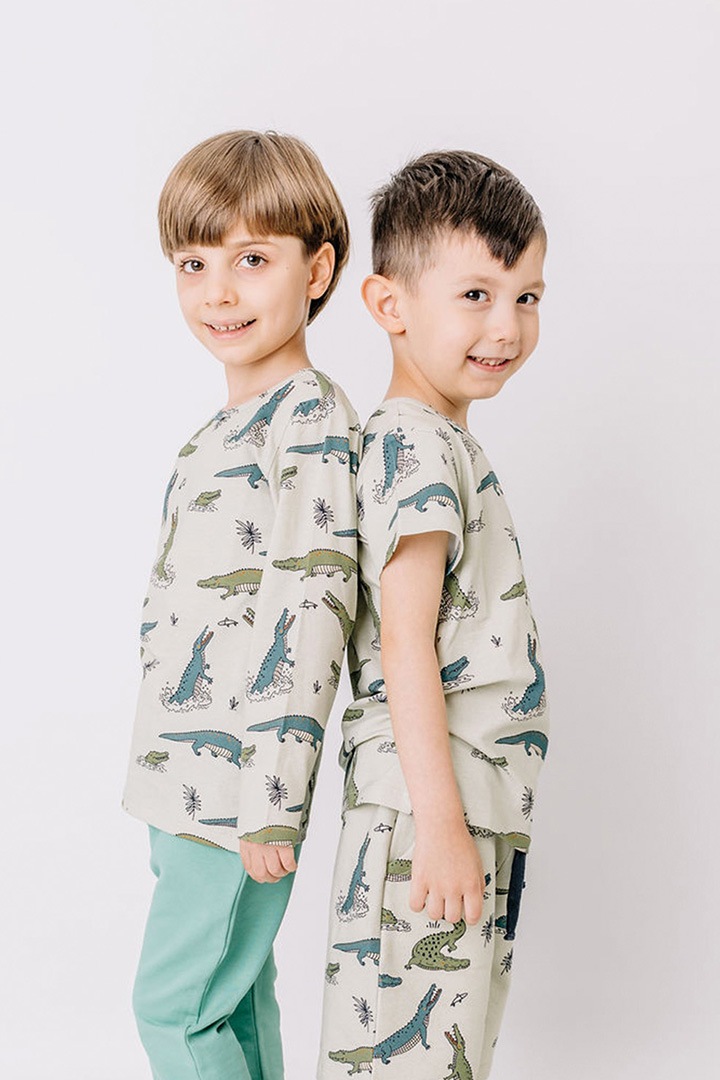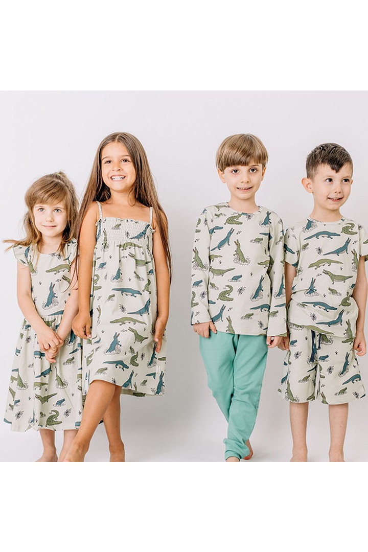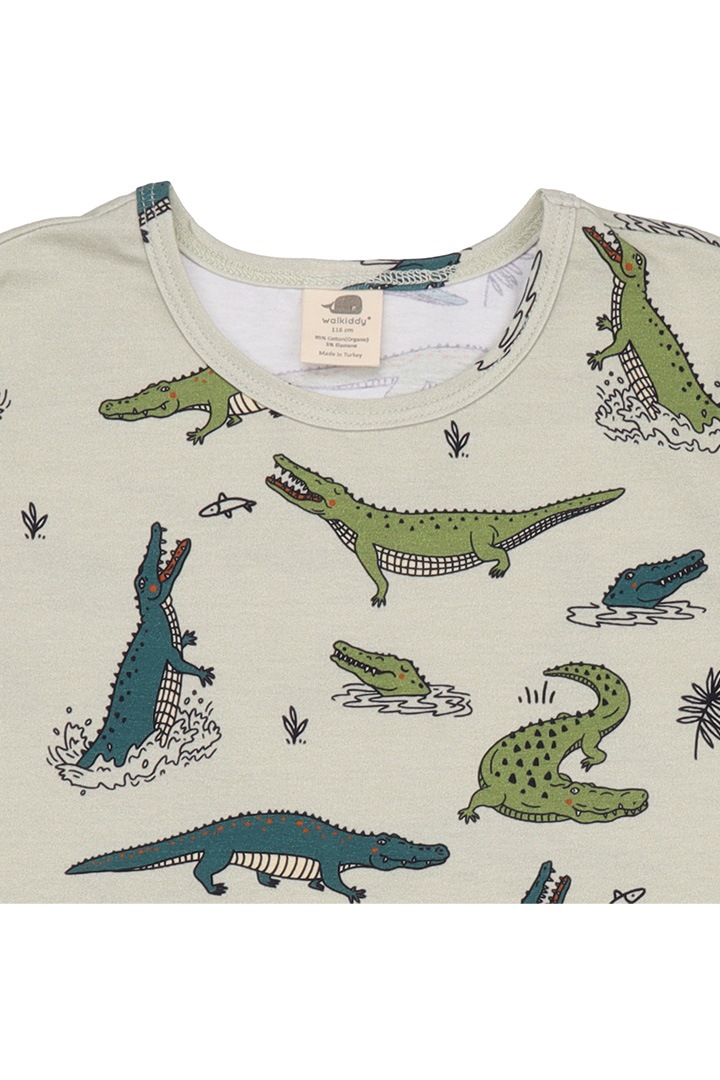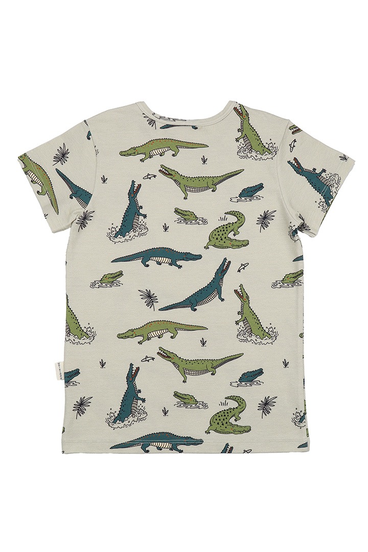 ワニのイラストが全体にプリントされたPOPでユニークな半袖Tシャツ。
