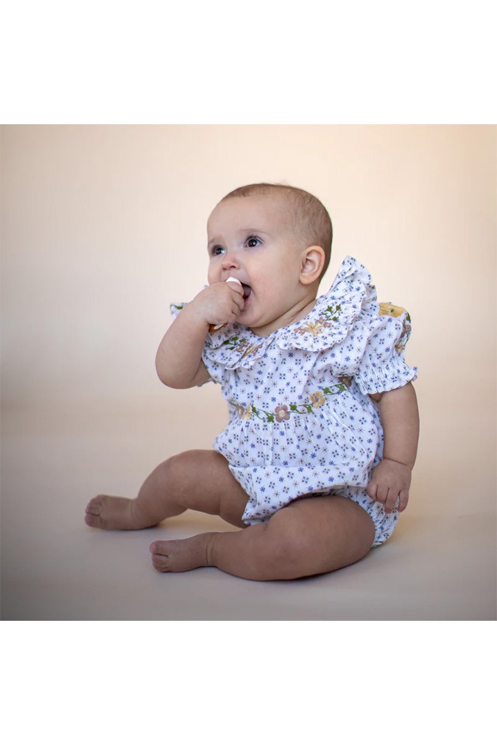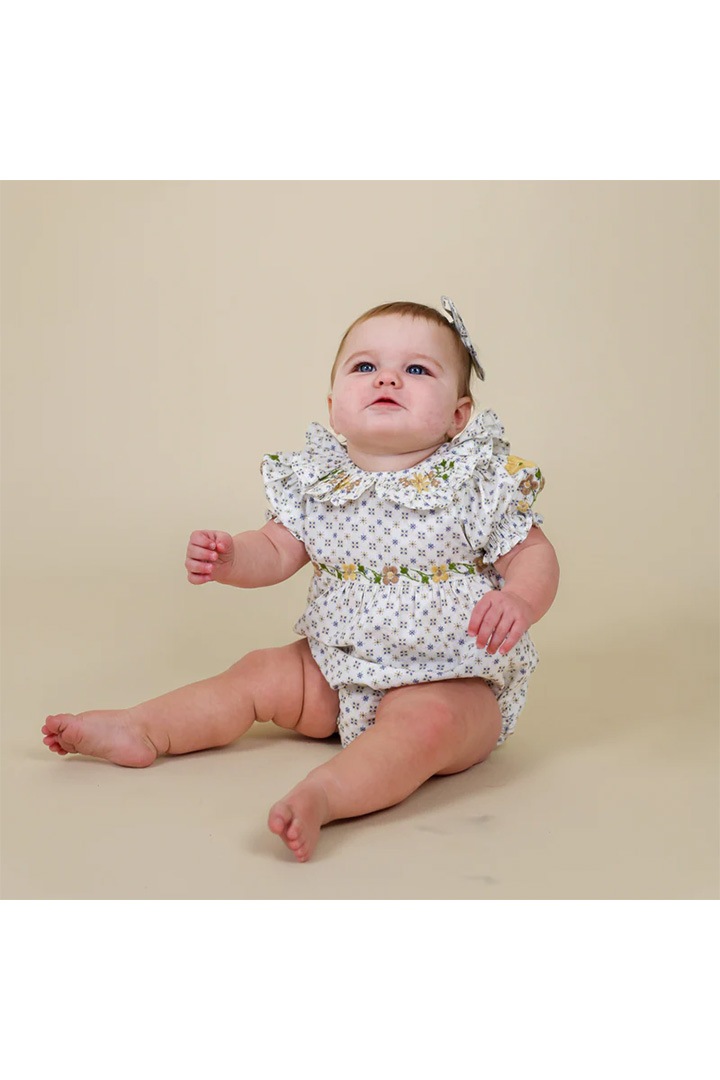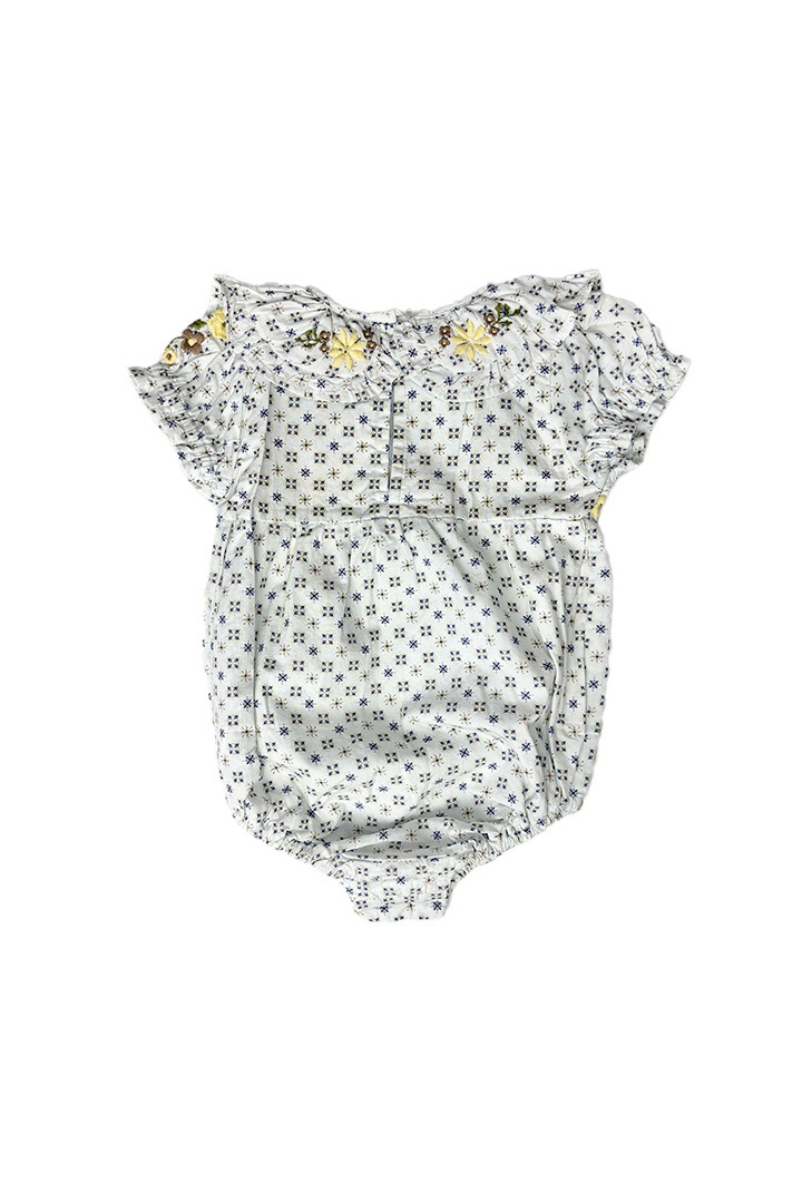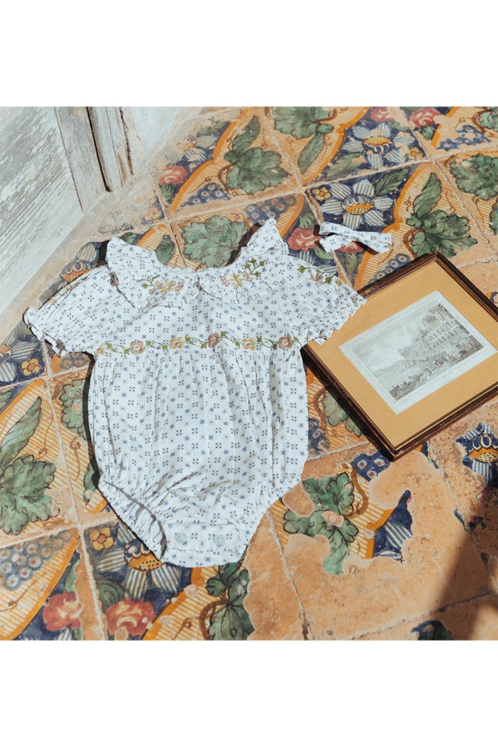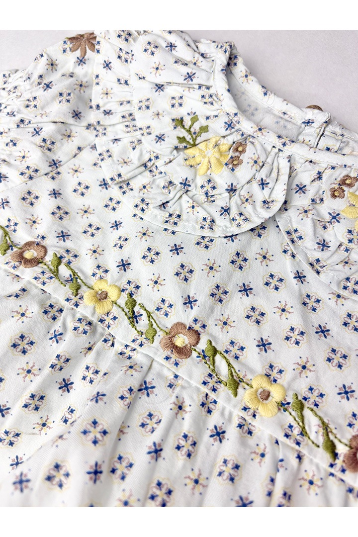 白地にくすみブルーや淡いブラウンのプリント柄。