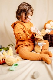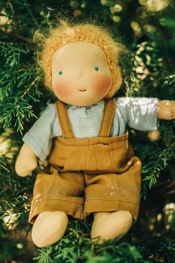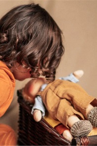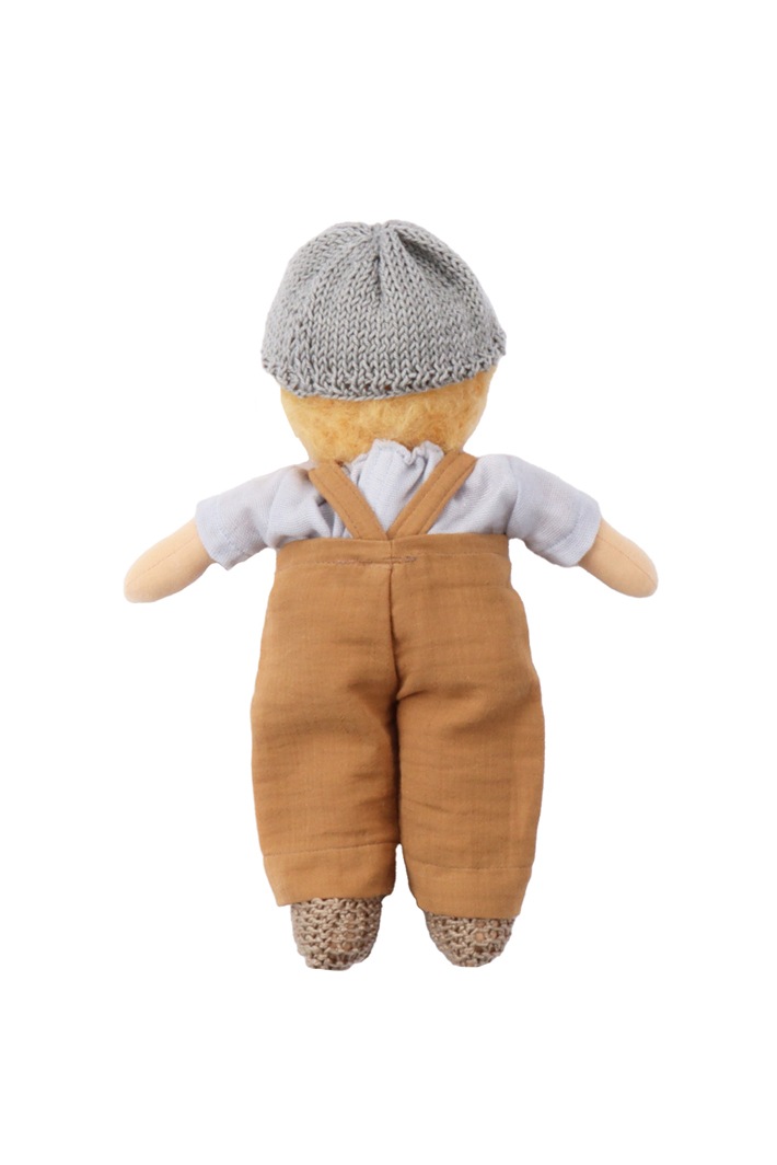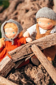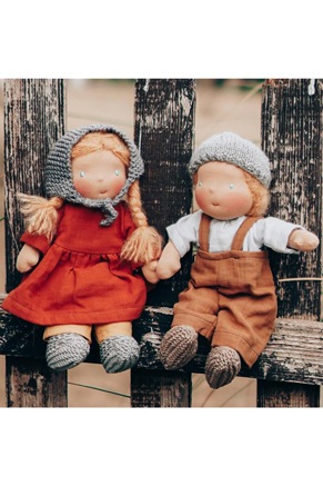 This lovingly crafted doll set, consisting of a girl and a boy, enchants with its natural charisma and minimalist design. The two dolls are handmade from high-quality, non-toxic natural materials and invite children to cuddle, play, and dream. The girl doll wears a warm, rust-colored dress and a knitted hat, while the boy doll is dressed in comfortable overalls and a knitted cap. The delicate, minimalist facial features stimulate children's imaginations and leave room for their own stories, feelings, and adventures. Thanks to their soft, cuddly filling and high-quality workmanship, the dolls are perfect as first friends for small children. Whether for free role play, as a source of comfort, or as a loyal companion in everyday life – these dolls promote emotional development, empathy, and creativity in a completely natural way. Features • Handmade from natural, non-toxic materials • Doll girl with dress and knitted hat • Doll boy with dungarees and knitted hat • Soft, cuddly filling for comfortable cuddling • Promotes emotional development, empathy and creative play • Clothing is removable and washable • Size: each approx. 30 cm • Ideal for children from 12 months