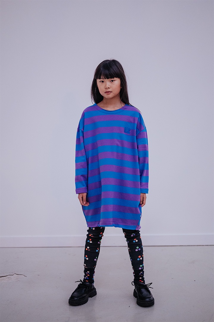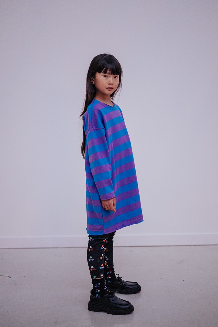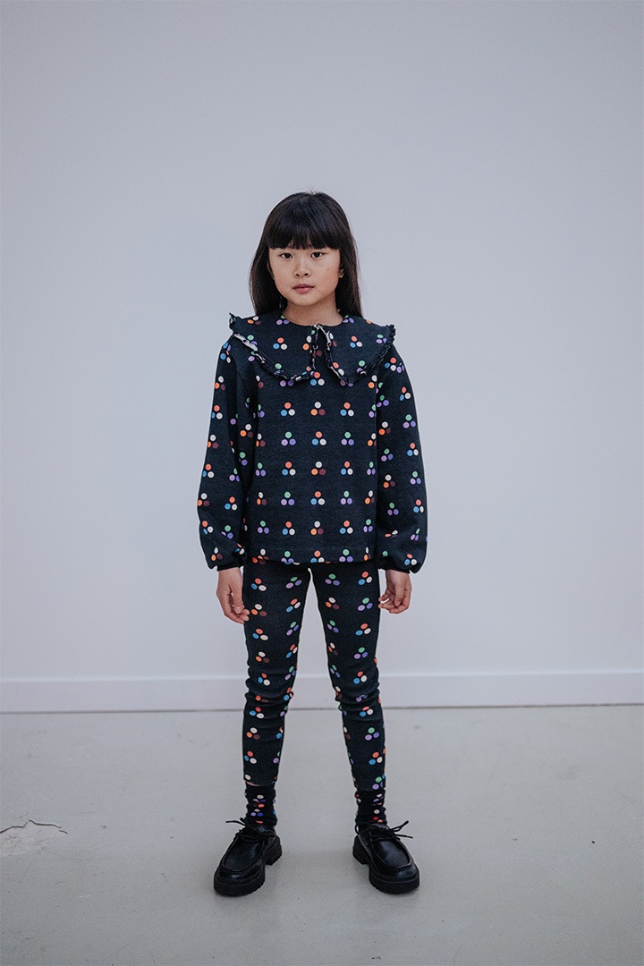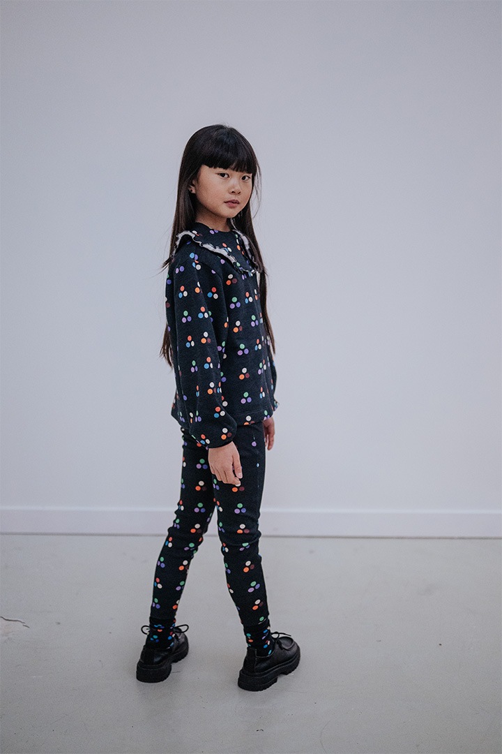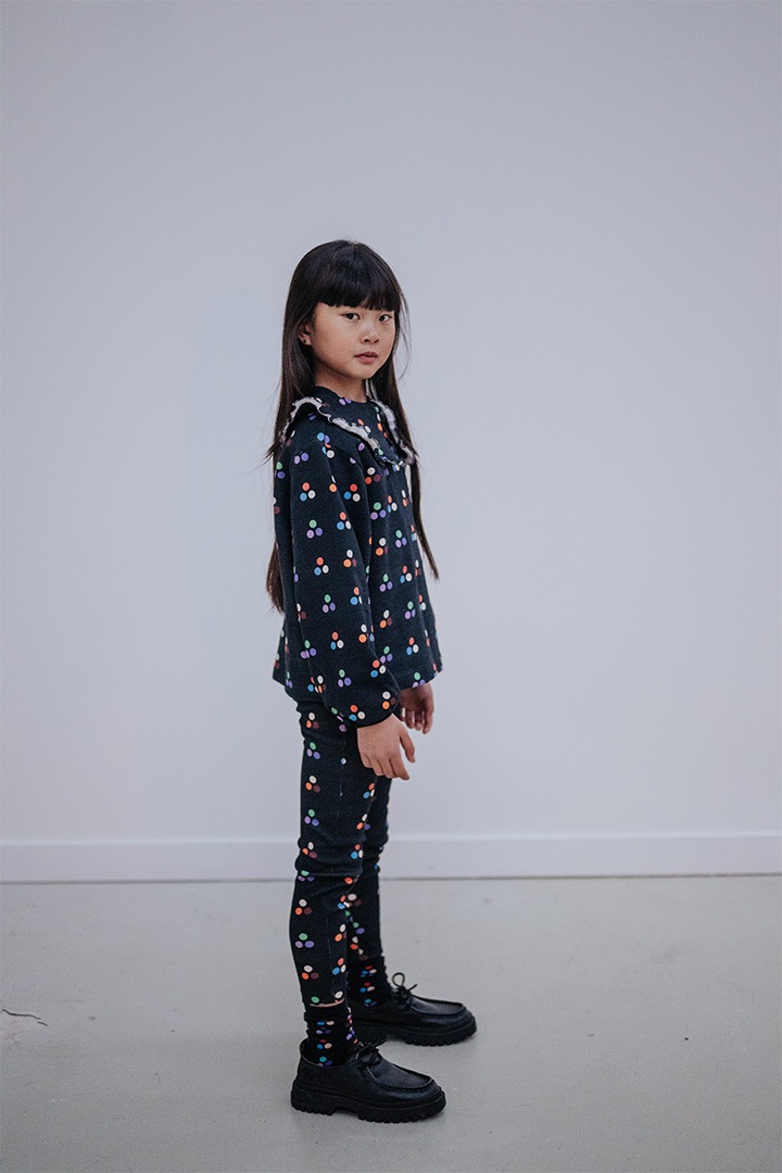 深めのネイビーカラーに、カラフルなドットのプリント柄。