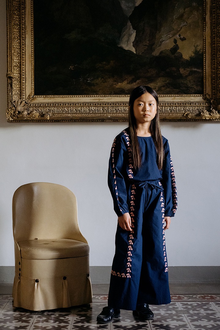 深いネイビーの生地に、ライトピンクのチェリー柄の刺繍。