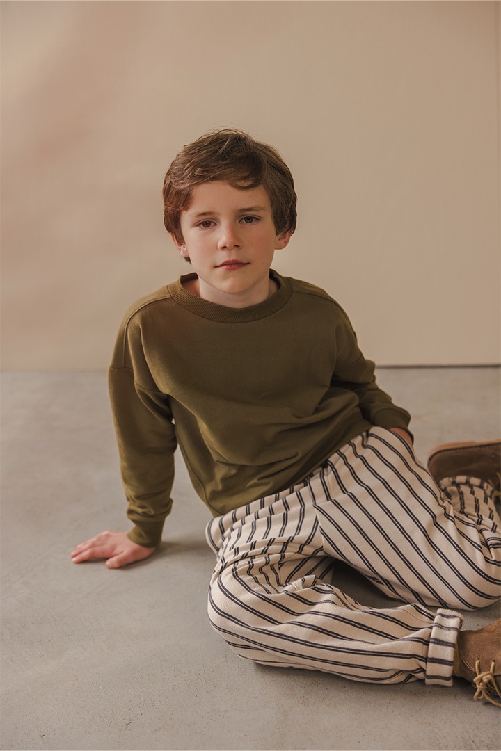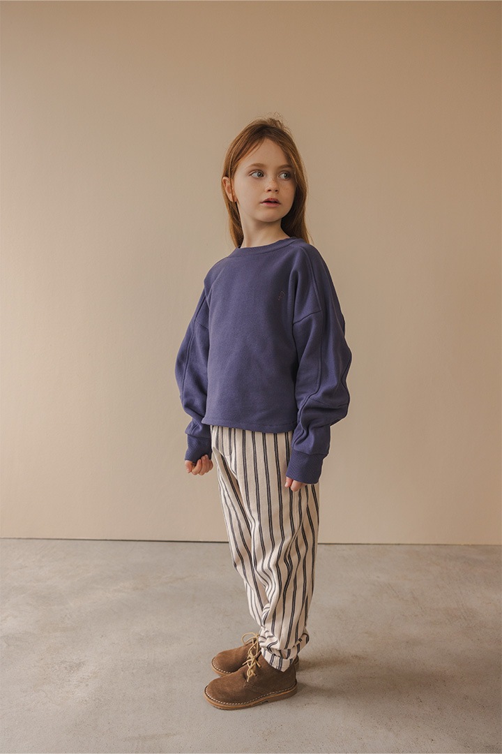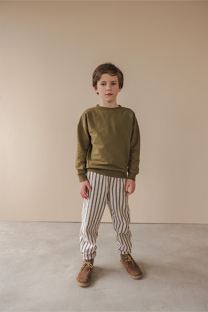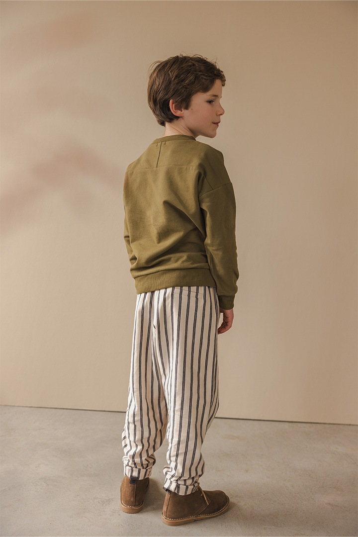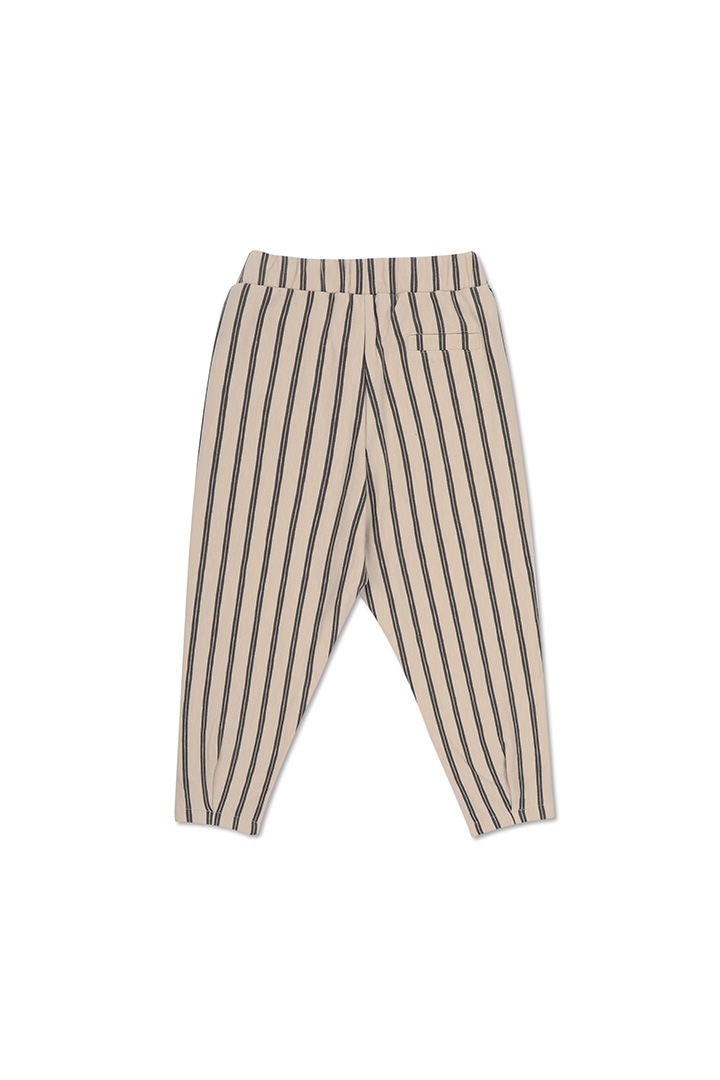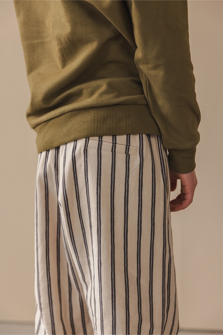 Limited edition fabric! We will only produce 100-150 pieces of this style! New shape pants with a baggy fit, sideseam pockets and faux pocket on the back. Made from a soft fleece fabric with stripes.