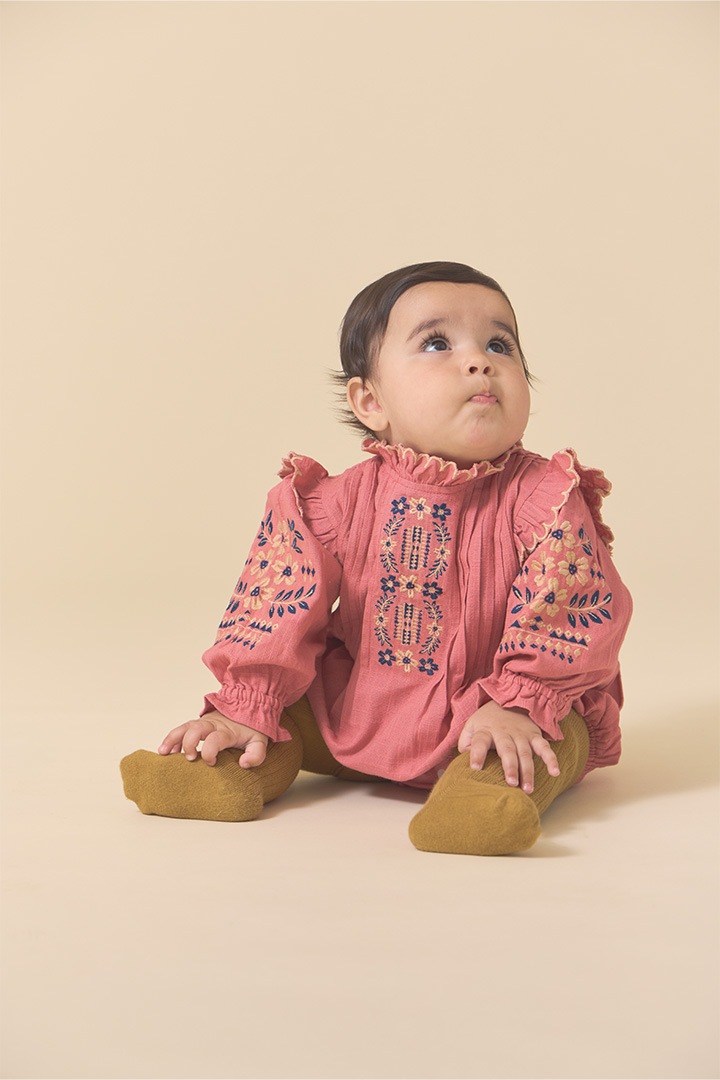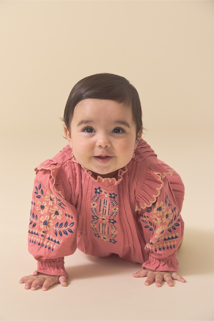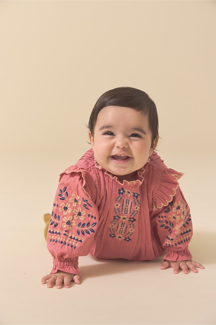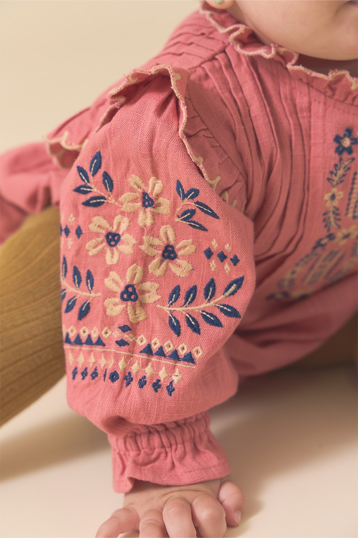 落ち着いたピンクのカラーにホワイトやブルーの刺繍。
