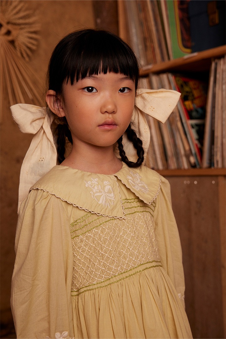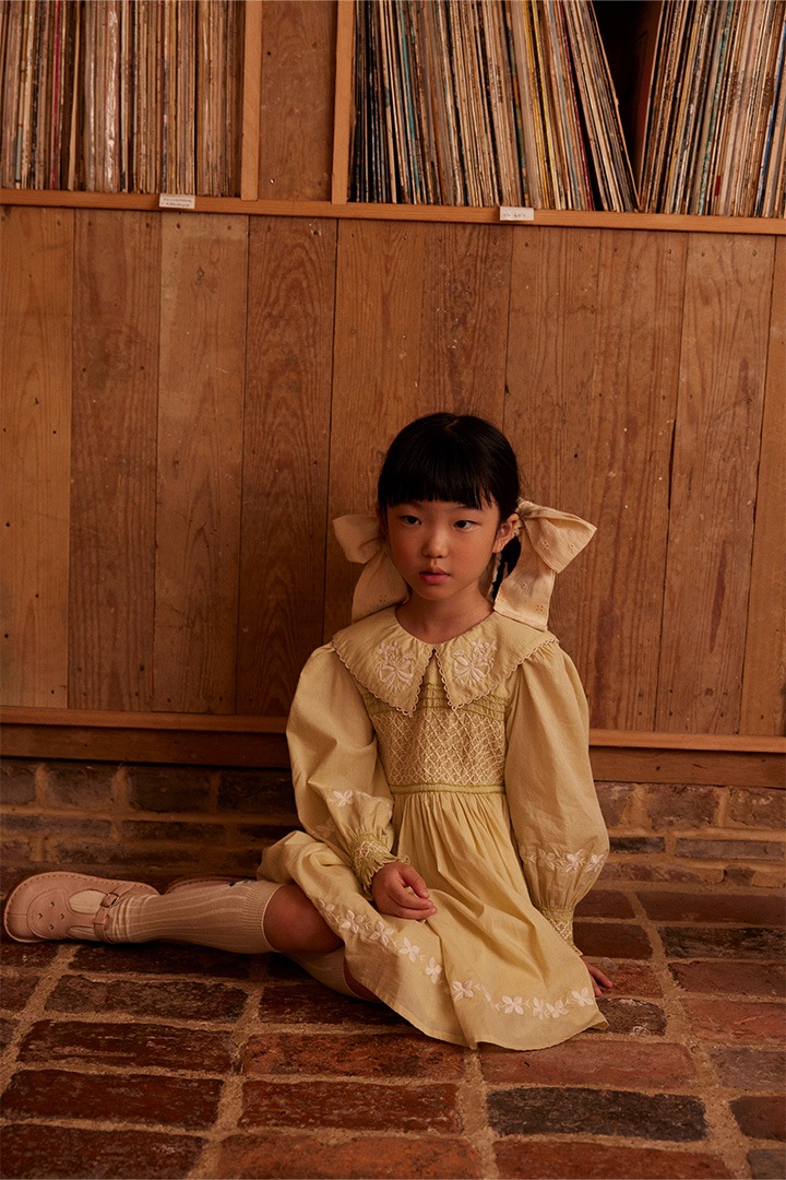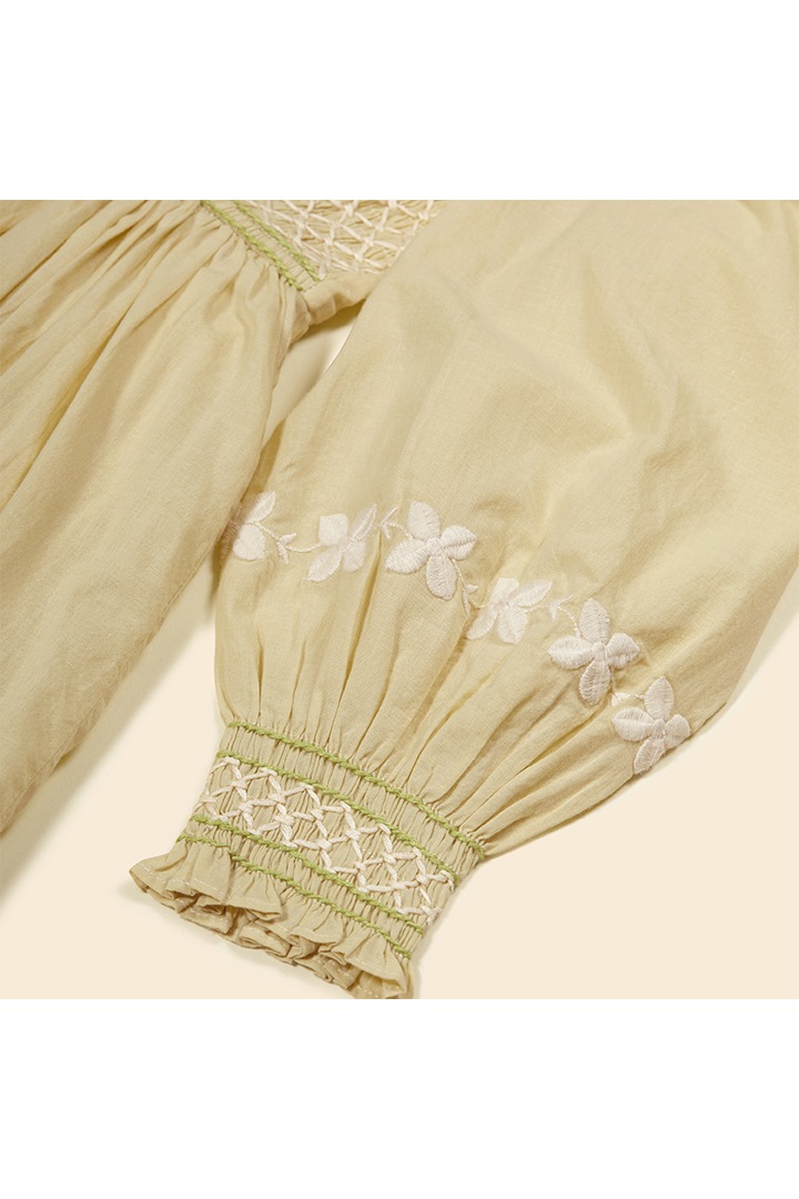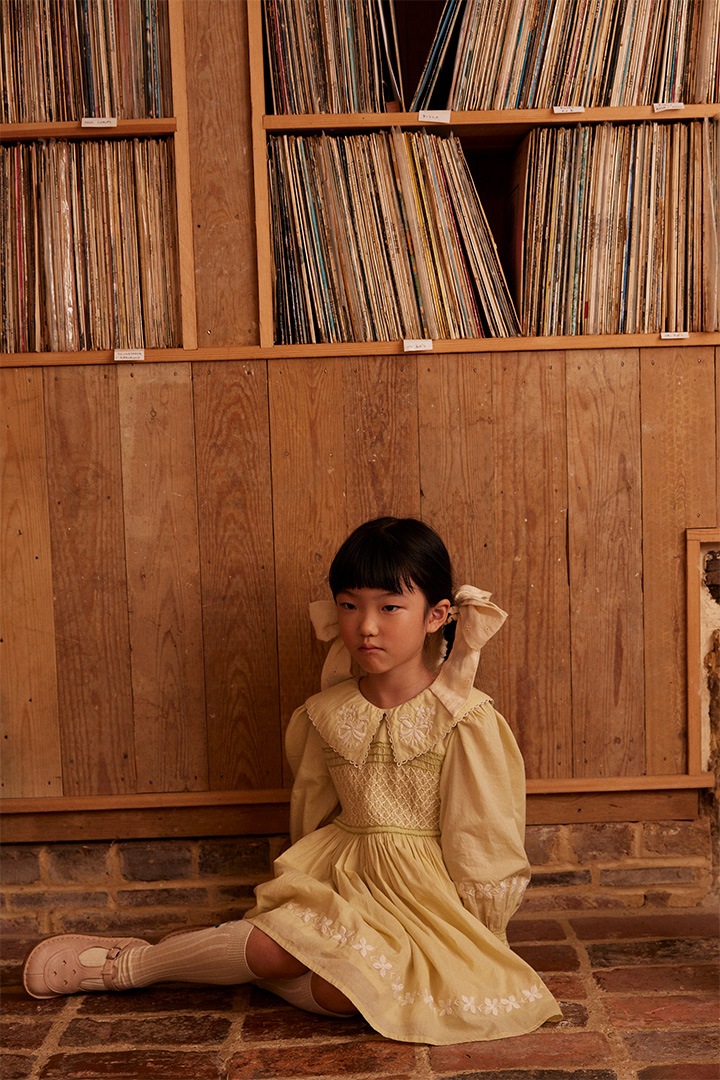 New this season, the ethereal Carey dress is crafted from our soft and light cotton cambric, with an organdie lining to her skirt for a sweet vintage silhouette. Featuring gently puffed sleeves with smocked cuffs, smocking at chest, hand finishing and pretty embroideries to the collar, cuffs and hemline. Invisible zip closure at back. Carey is made for special occasions, simply pair her with socks and Mary Janes.