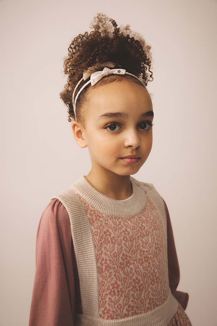 rosewoodカラーの花柄に、肩の大きなボタンや、ベージュがアクセント。