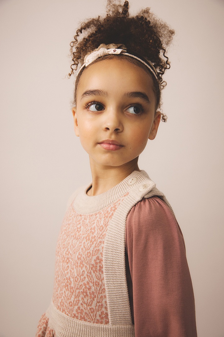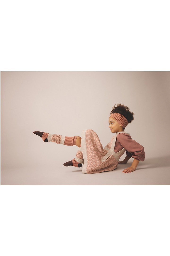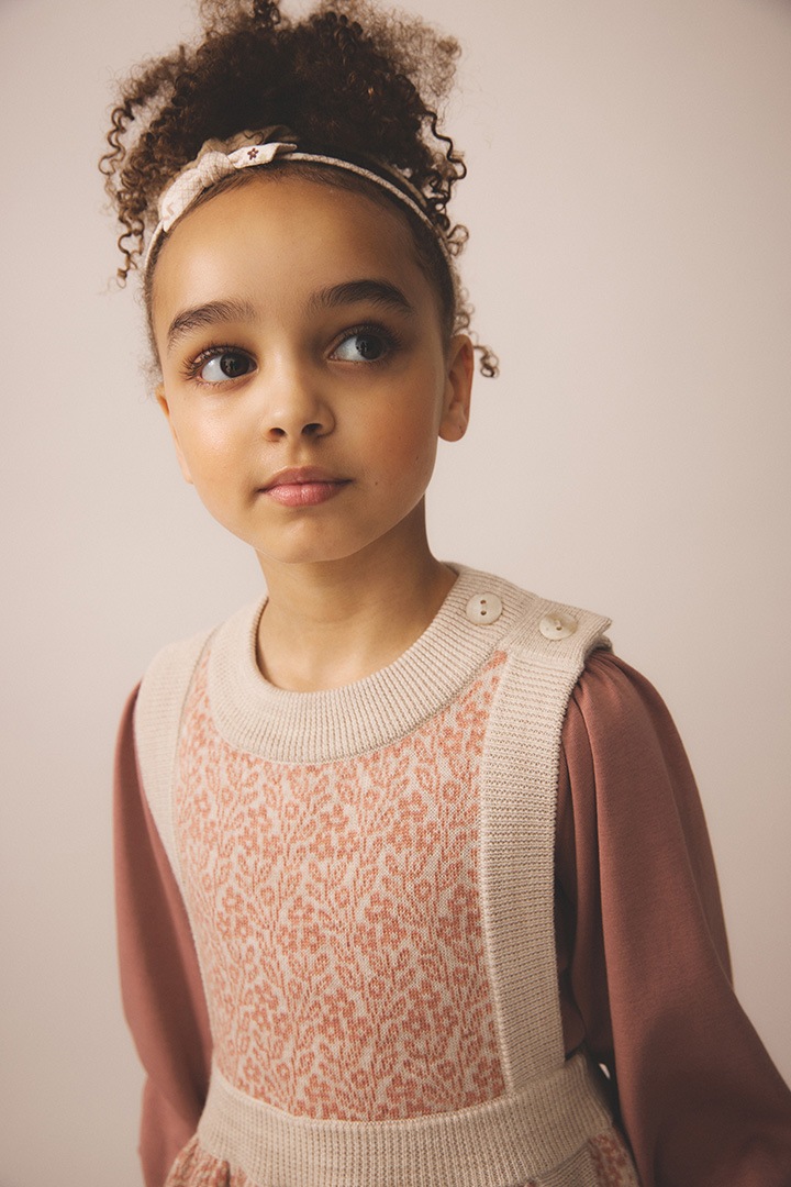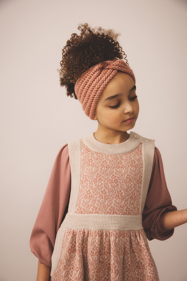 Full bodied pinafore in our double knit, grow stitch jacquard. Natural horn buttons at shoulder, ribbed pockets, and chunky rib finishing.