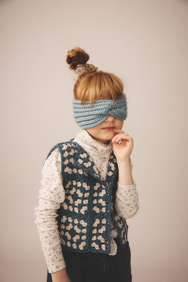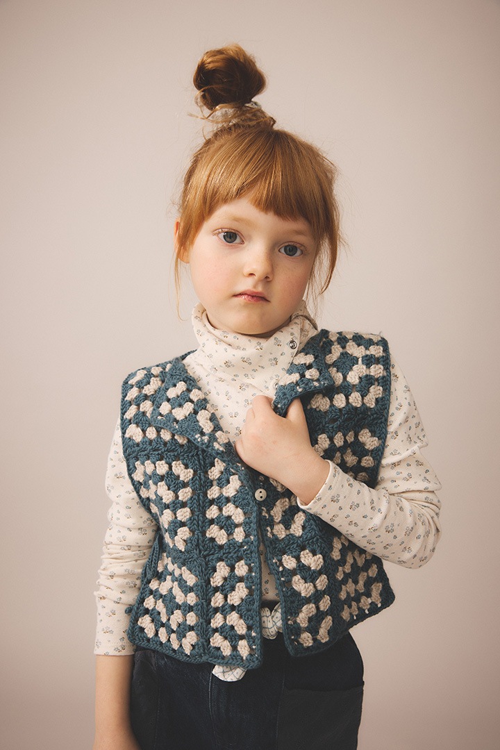 Hand crochet granny square smock with a double horn button closure and ties at sides.