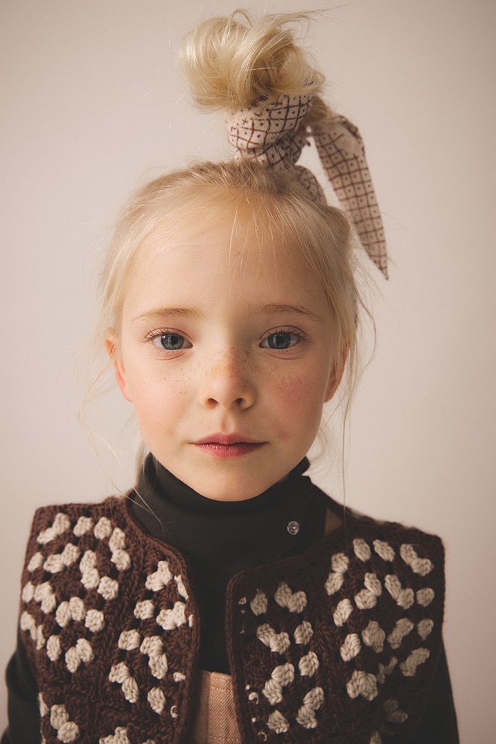 Hand crochet granny square smock with a double horn button closure and ties at sides.