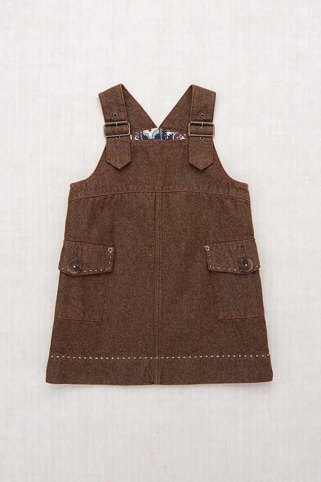 A vintage-inspired jumper dress in 100% cotton denim, featuring adjustable buckle straps, two patch pockets with horn button closure, a print-lined bib, and contrast topstitch detail. Finished with hand-tacked stitches instead of rivets for softness.