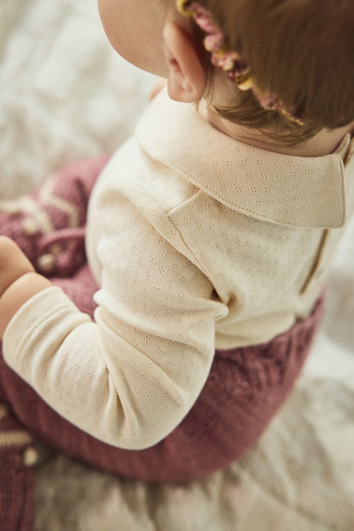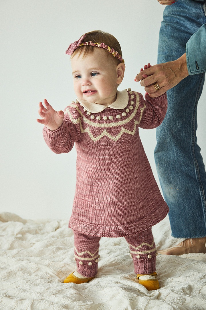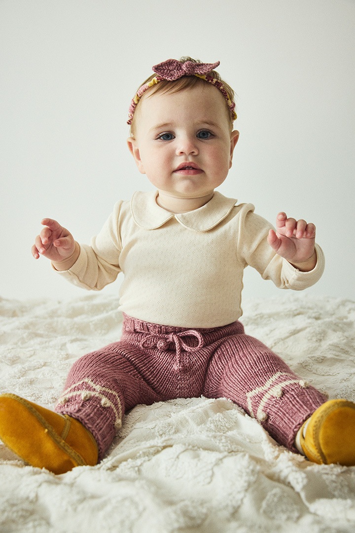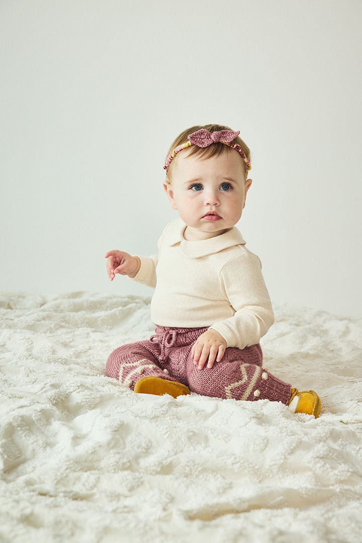 A headband featuring a sweet hand-knit leaf motif in Merino wool and an attached covered elastic band.