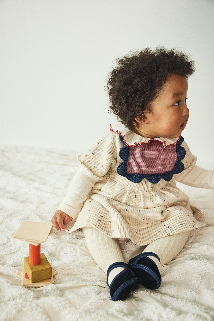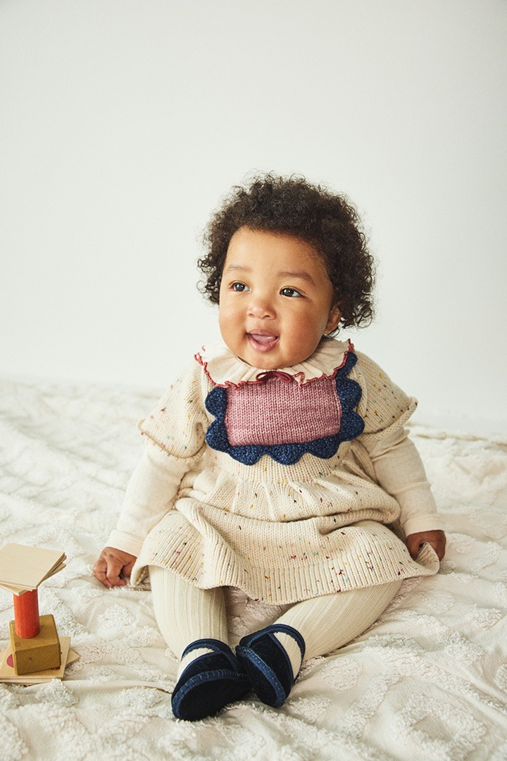 A long-sleeved onesie in organic Pima cotton, featuring a ruffle collar with a contrast merrowed edge and mini bow. Finished with snap closure at the bottom and back neck ― perfect on its own or layered for a versatile, buildable look.